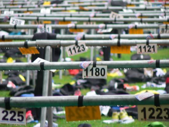 Faccio il mio primo cambio di attrezzatura, notando che tutto quello che avevo preventivato è andato a farsi benedire, perché l’asciugamano è da strizzare e non serve più a nulla, le scarpe della bici devono essere svuotate dall’acqua presente, quelle da corsa non ne parliamo e soprattutto ho già freddo per la bella brezza temporalesca in atto.